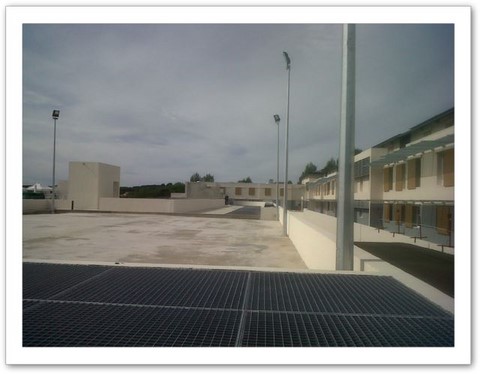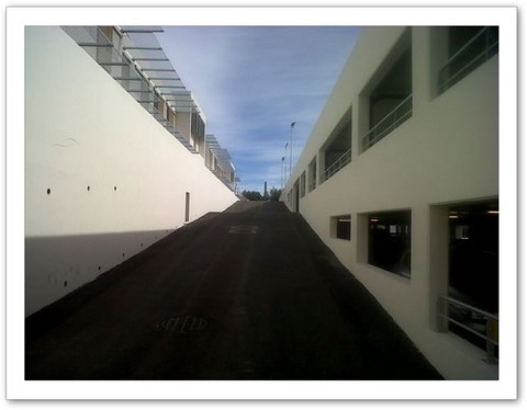 La desserte vertical du centre, depuis le parking, en contrebas, par un ascenceur panoramique relié à l'entrée principale par une passerelle métallique.