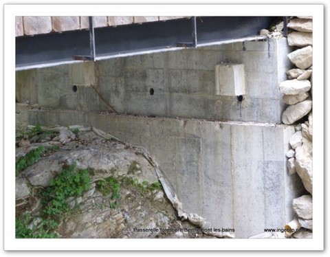 Les culées sont ancrées par des tirant au substratum de fond de rivière de manière à résister aux crues et efforts de passage de véhicule. Etude d'ancrage menée par notre partenaire IMSRN.