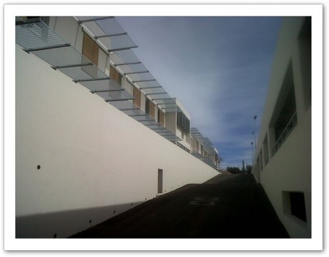 La desserte vertical du centre, depuis le parking, en contrebas, par un ascenceur panoramique relié à l'entrée principale par une passerelle métallique.